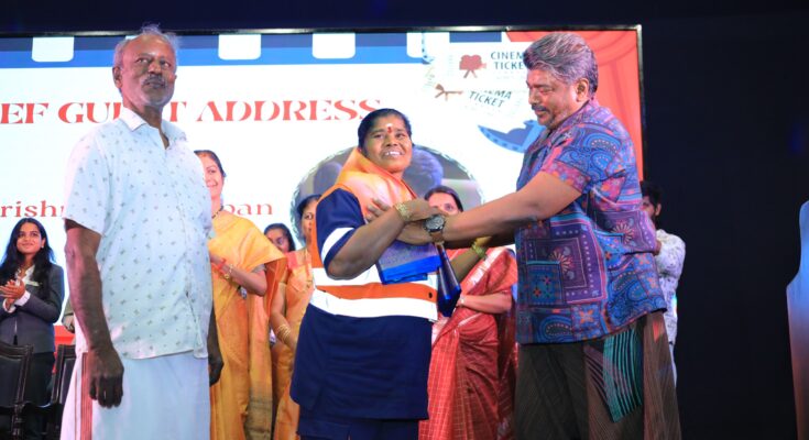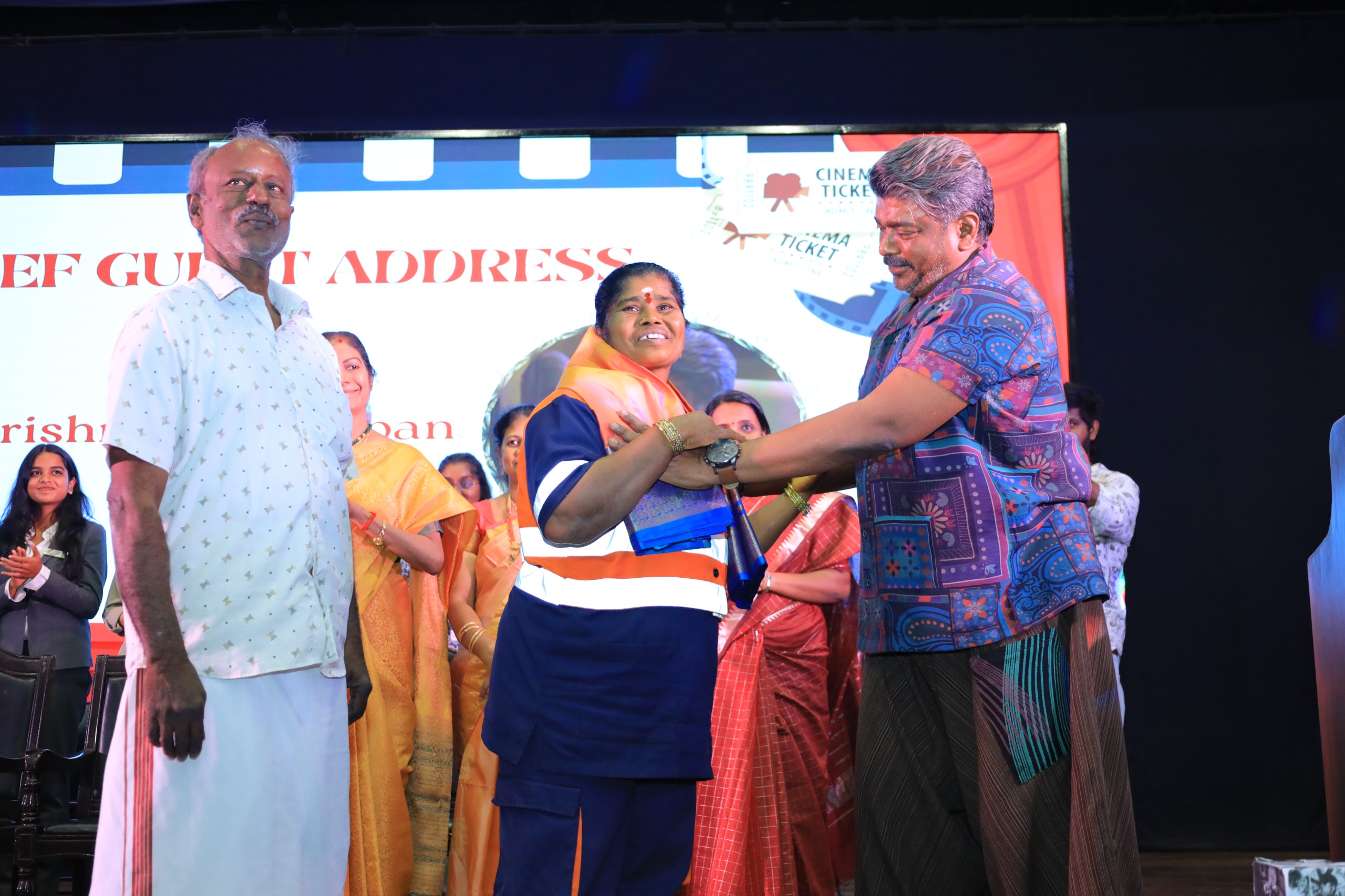 இந்நிலையில் புதுமைகளின் புகலிடமாக விளங்கும் இயக்குநரும் நடிகருமான இராதாகிருஷ்ணன் பார்த்திபன் தூய்மை பணியாளர் பத்மாவை எத்திராஜ் மகளிர் கல்லூரிக்கு அழைத்து சென்று கௌரவித்துள்ளார்.