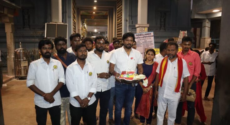 இன்றைக்கு விசில் சின்னத்தை முருகனின் பாதத்தில் வைத்து விஜய் பெயரில் அர்ச்சனையும் கட்சி கொடி மற்றும் சின்னத்திற்கு சிறப்பு பூஜையும் செய்து பொதுமக்களுக்கு விசிலும், லட்டும் வழங்கி கொண்டாடி வருகிறோம்.