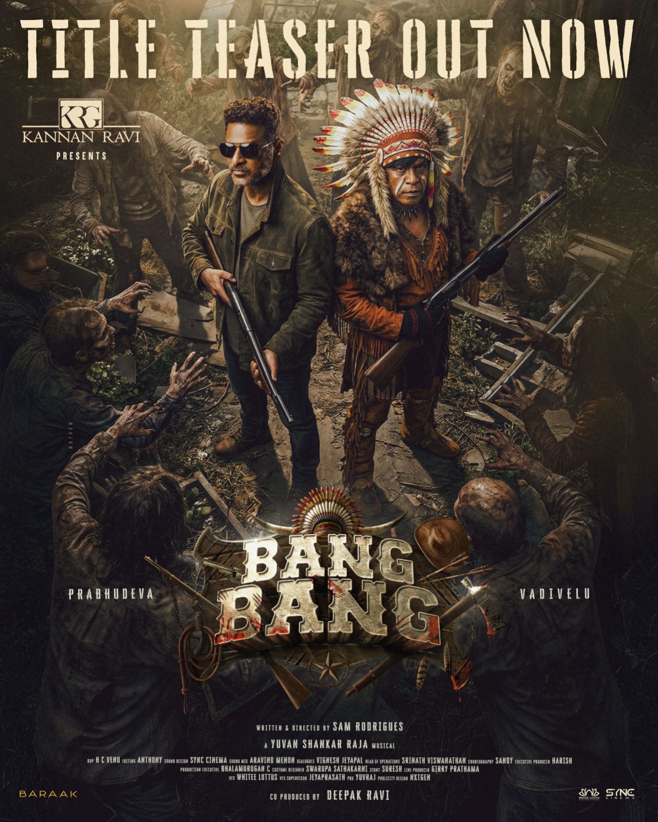 KRG கண்ணன் ரவியின் பிரமாண்ட தயாரிப்பில், தீபக் ரவி இணைத் தயாரிப்பில், தமிழ் திரையுலகின் மறக்க முடியாத கூட்டணியான நடனப்புயல் பிரபுதேவா, வைகைப்புயல் வடிவேலு மற்றும் இசையமைப்பாளர் யுவன் சங்கர் ராஜா மூவரும் 25 ஆண்டுகள் கழித்து மீண்டும் இணையும் “பேங் பேங்” படத்தின் டைட்டில் டீஸர் தற்போது அதிகாரப்பூர்வமாக வெளியிடப்பட்டுள்ளது. அந்த டீஸரில் ஜாம்பியாக மாறி ஓடுகிறார்கள். பிரபு தேவாவும், வடிவேலுவும் துப்பாக்கியுடன் கெத்தாக வருகிறார்கள். வடிவேலு ஜாம்பி என்று கூறுகிறார். பிரபு வேலு, வடி தேவா என்று பெயரோடு டீஸரை பார்க்கும் போது படத்தை பார்க்கும் ஆவலை தூண்டுகிறது.