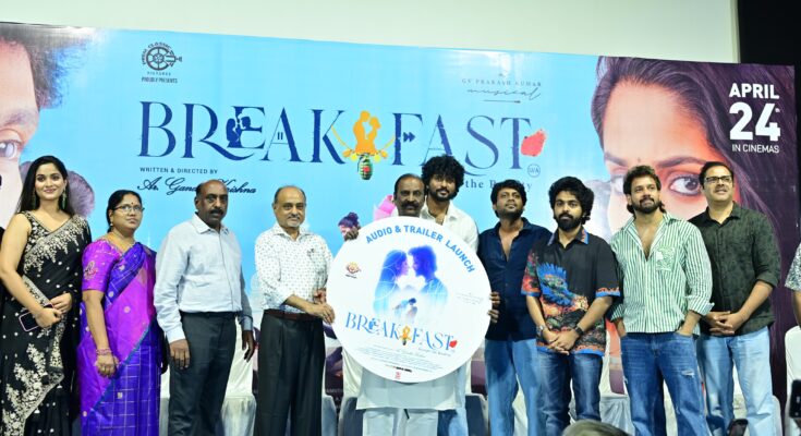 ‘செல்லமே’, ‘ஆனந்த தாண்டவம்’ படங்களை இயக்கிய காந்தி கிருஷ்ணா இயக்கத்தில், கிரிஜா வரதராஜ் தயாரிப்பில், நடிகர்கள் ராணவ், ரோஸ்மின், சம்பத்குமார், கஸ்தூரி, கிருத்திக் மோகன் உள்ளிட்டப் பலர் நடித்திருக்கும் திரைப்படம் ‘பிரேக்ஃபாஸ்ட்’. இந்த மாதம் 24 ஆம் தேதி வெளியாக இருக்கும் இந்தப் படத்தின் இசை வெளியீட்டு விழா நடைபெற்றது.