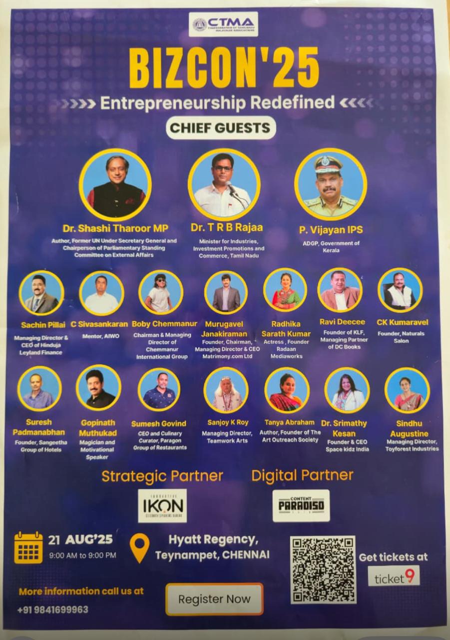 பல தடைகளை கடந்து தங்கள் தொழிலில் வெற்றி பெற்று மற்றவர்களுக்கு உந்துதலாக இருக்கும் பேச்சாளர்கள், தொலைநோக்கு பார்வை கொண்டவர்கள் என பல முக்கியஸ்தர்கள் இந்த உச்சிமாநாட்டில் கலந்து கொள்கிறார்கள். ஆகஸ்ட் 21, 2025 அன்று சென்னை ஹயாத் ரீஜென்சியில் நடைபெறும் இந்த மதிப்புமிக்க நிகழ்வுக்கு உங்கள் அனைவரையும் அன்புடன் அழைக்கிறோம்.