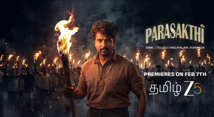 இந்தியாவின் மிகப் பெரிய உள்நாட்டு வீடியோ ஸ்ட்ரீமிங் தளமான ZEE5, மிகவும் எதிர்பார்க்கப்பட்ட பொலிடிகல் ஆக்ஷன் டிராமாவான “பராசக்தி” திரைப்படத்தை 2026 பிப்ரவரி 7 முதல் டிஜிட்டல் பிரீமியராக வெளியிடவுள்ளது. தேசிய விருது பெற்ற இயக்குநர் சுதா கொங்கரா இயக்கத்தில், Dawn Pictures நிறுவனம் சார்பில் ஆகாஷ் பாஸ்கரன் தயாரித்துள்ள இந்தப் படம், தமிழ்நாட்டின் சமூக-அரசியல் வரலாற்றிலிருந்து ஒரு சக்திவாய்ந்த அத்தியாயத்தை திரையில் உயிர்ப்பிக்கிறது.