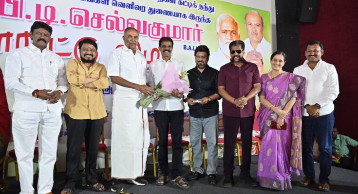 இயக்குநர் பி டி செல்வகுமாரை ”30 வருசத்துக்கு மேலா தெரியும். பத்திரிகையாளர், திரைப்பட தயாரிப்பாளர், இயக்குநர், நடிகர்னு பல அவதாரங்கள் எடுத்திருக்கார். நாட்டாமை படத்துல நடிச்சிருக்கார். அதனாலேயோ என்னவோ அவரே நாட்டாமையா மாறி பஞ்சாயத்து செய்து ரிலீஸ் பண்ண முடியாம பிரச்சனைகள்ல சிக்கியிருந்த ஏகப்பட்ட படங்களை ரிலீஸ் பண்ண உதவி பண்ணிருக்காரு. அவரோட கலப்பை மக்கள் இயக்கத்தோட பணிகள் பத்தி எனக்கு தெரியும். அவரு சினிமாவுல தளபதி விஜய்கூட இருந்தாரு. அரசியல்ல தளபதி ஸ்டாலின் அவர்களோட இருக்காரு. சினிமாவுல, சமூக சேவைகள்ல சாதிச்சது மாதிரி அரசியல்லயும் அவர் பெரியளவுல சாதிக்கணும்னு வாழ்த்தறேன்” என்றார்.